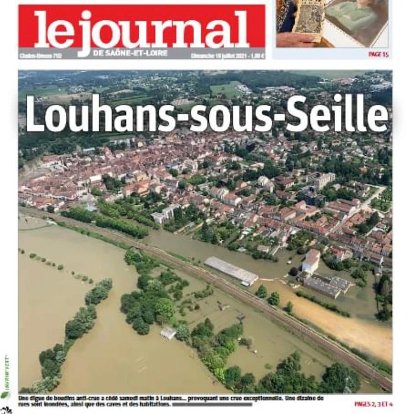 scan du journal de Saône et Loire titrant Louhans sous Seille avec photo aérienne
