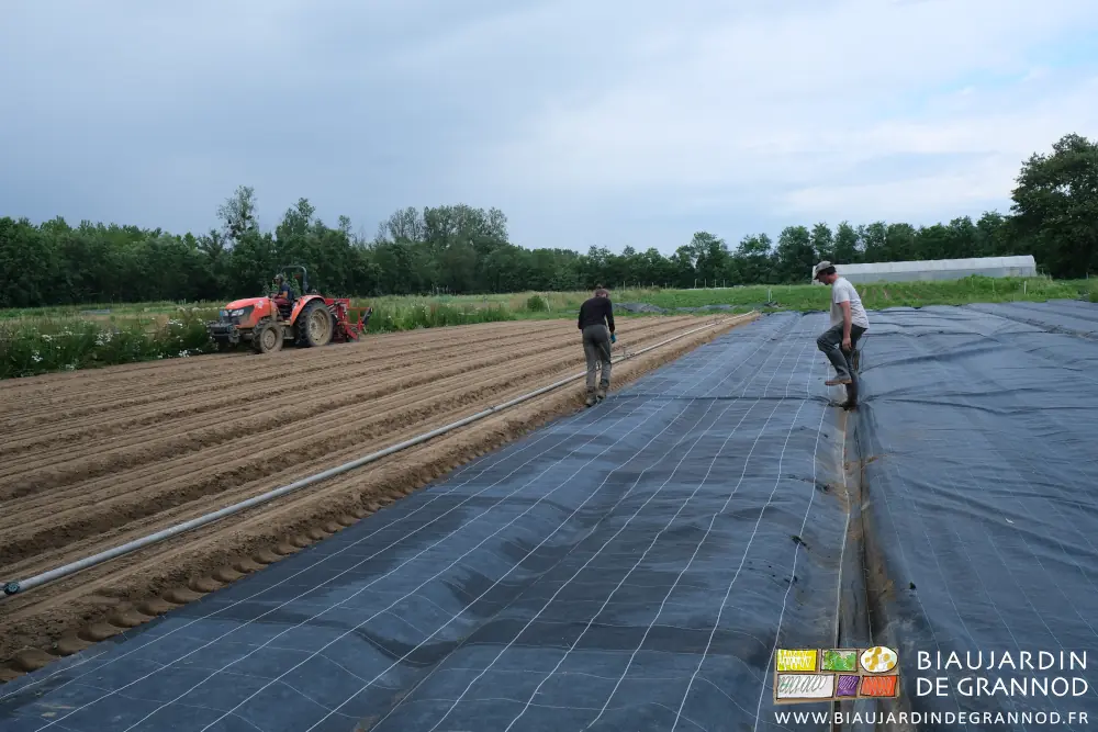 Et comme l’ambiance était de plus en plus humide et le ciel de plus en plus chargé, dès que quelques planches furent [1]encore!? semées Émilie et Vivien se mirent [2]ha oui?! à dérouler en place à nouveau les toiles d’occultation par dessus