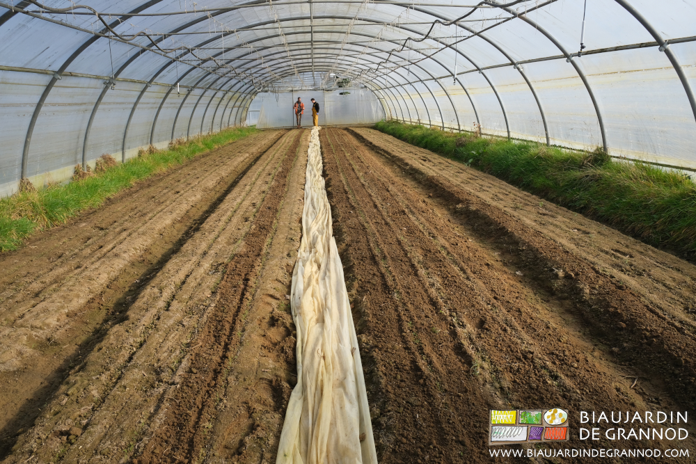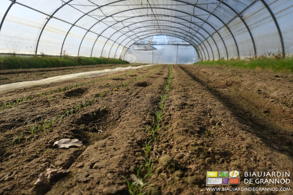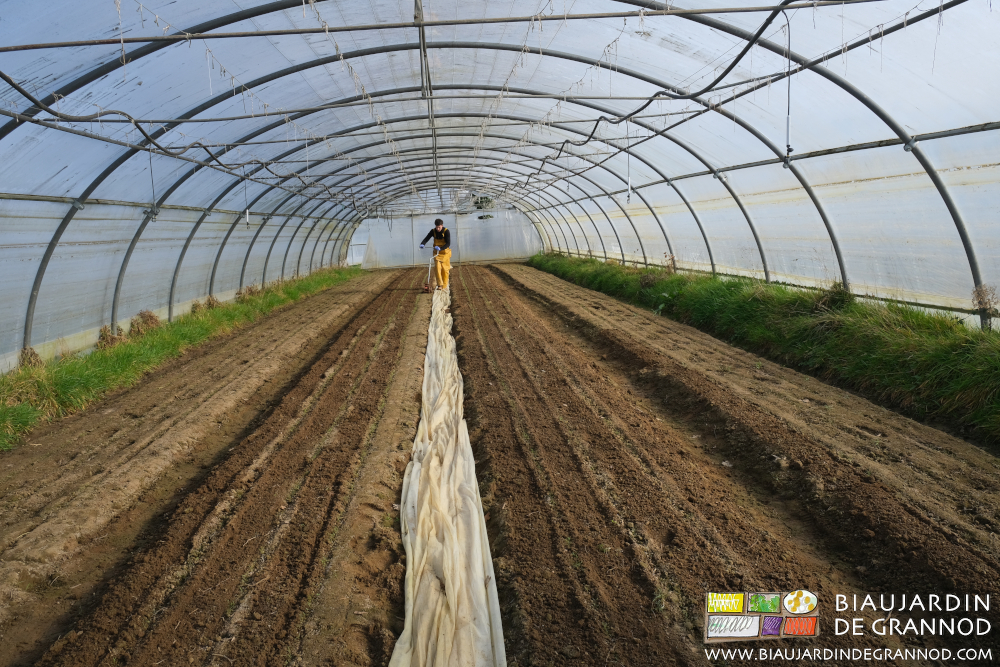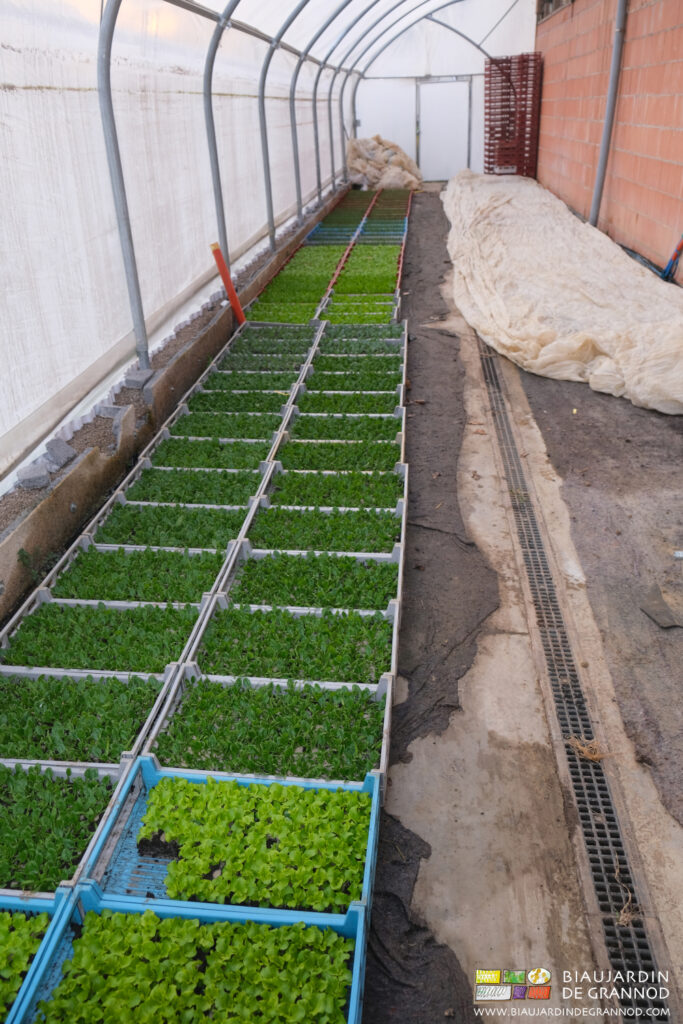Les plaques ensuite «se rangent» dans la serre solaire, sont arrosées et couvertes d’un voile de protection contre le froid. En face d’une tournée de plants (épinard, salade, chou, oignon…) de Vincent, notre pépiniériste 100% bio.