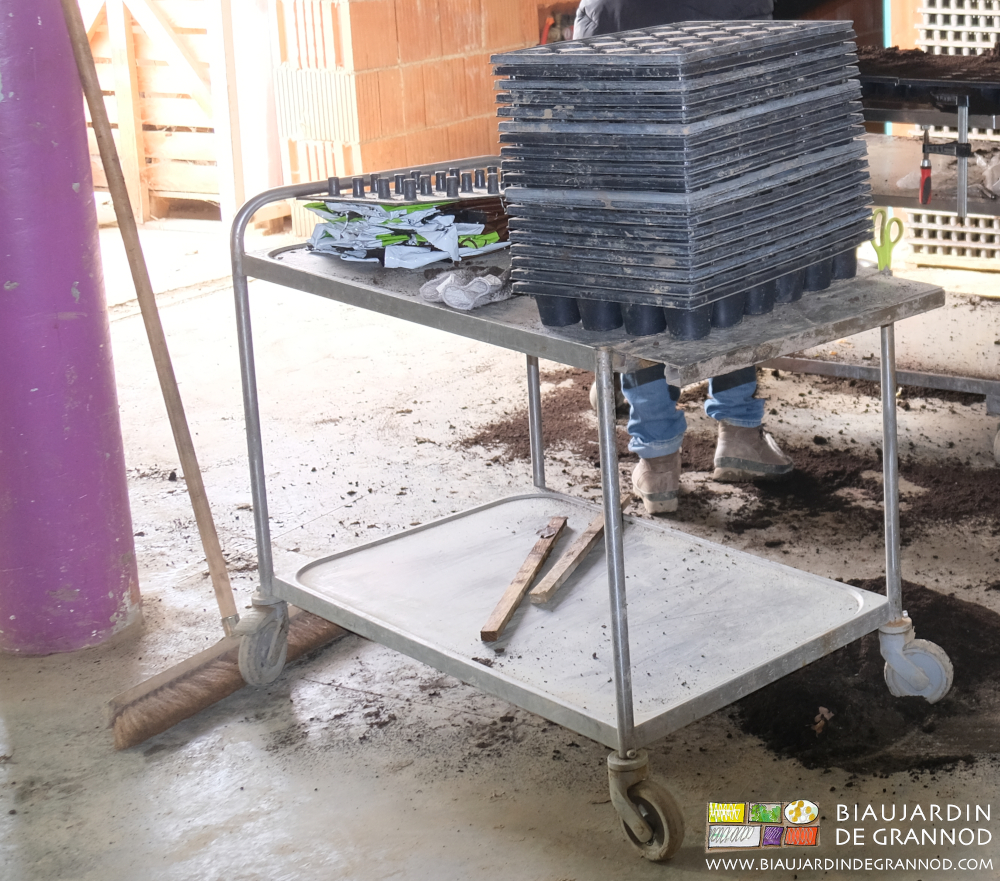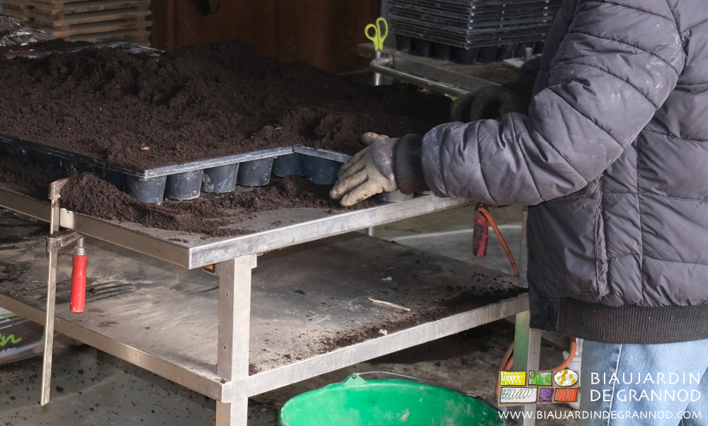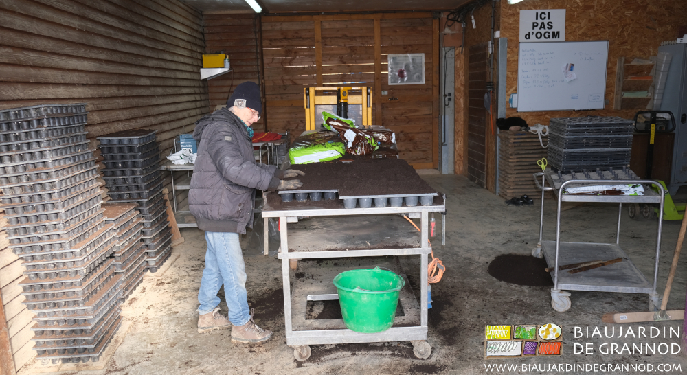Les piles de plaques vides «descendent», les sacs de terreau «se vident», les plaques de mottes «se remplissent», puis «s’empilent» contre le mur en attendant d’être semées des premières variétés de petit pois et de fève.