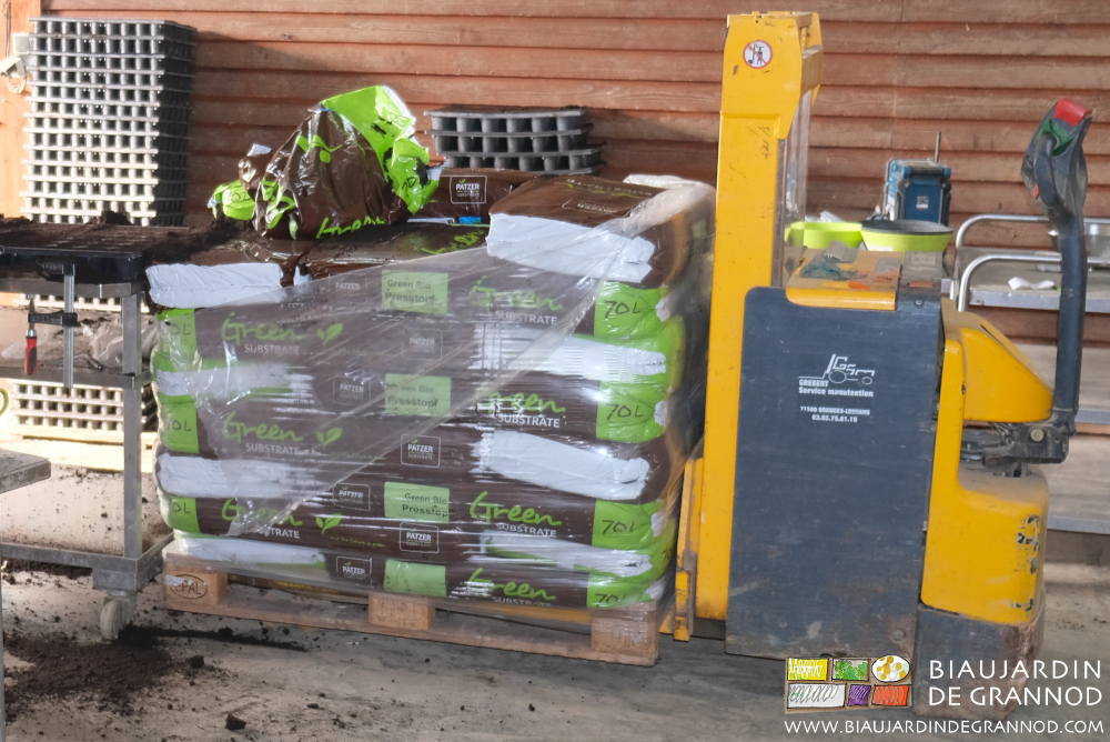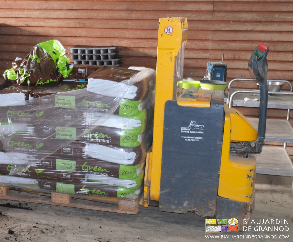 Et de les lever à bonne hauteur, facilement adaptable, par le jeu d’un bouton et d’une petite pompe, au niveau du stock de sacs sur la palette, pour remplir les plaques de terreau.