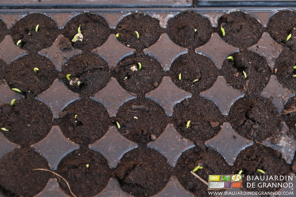 Plusieurs jours après, les plants de Vincent sont repiqués, et nos pois et fève lèvent.