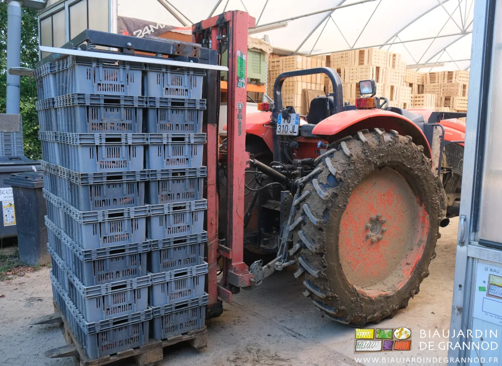 Les Biaux Jardiniers utilisent des mâts lève-palette : pour transporter palettes et palox dans la ferme.